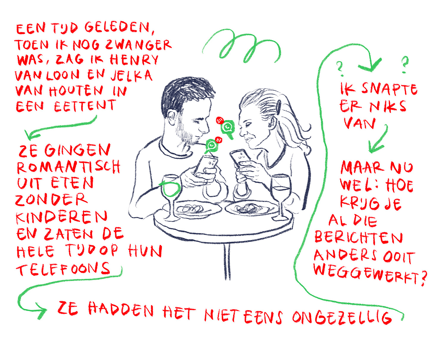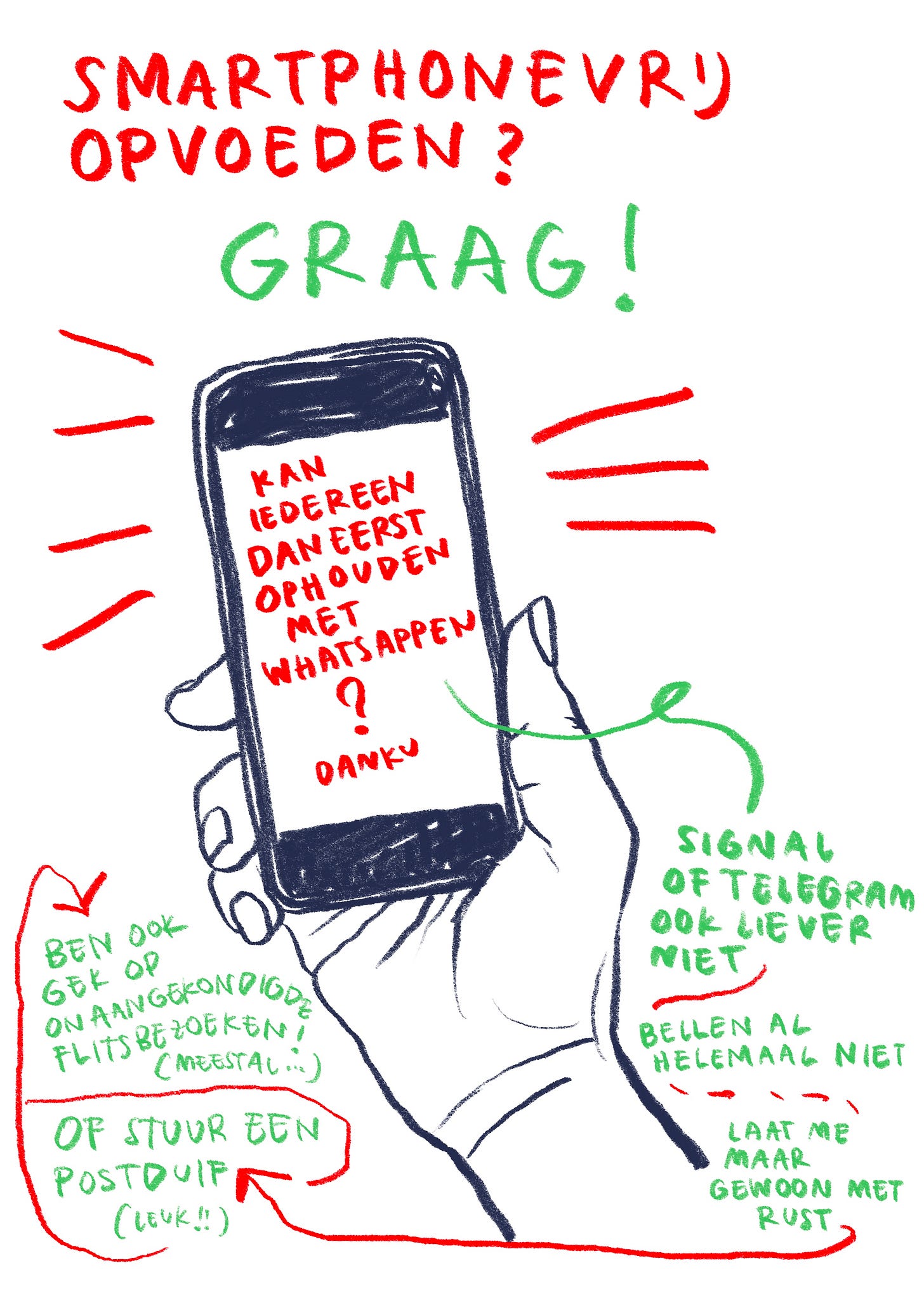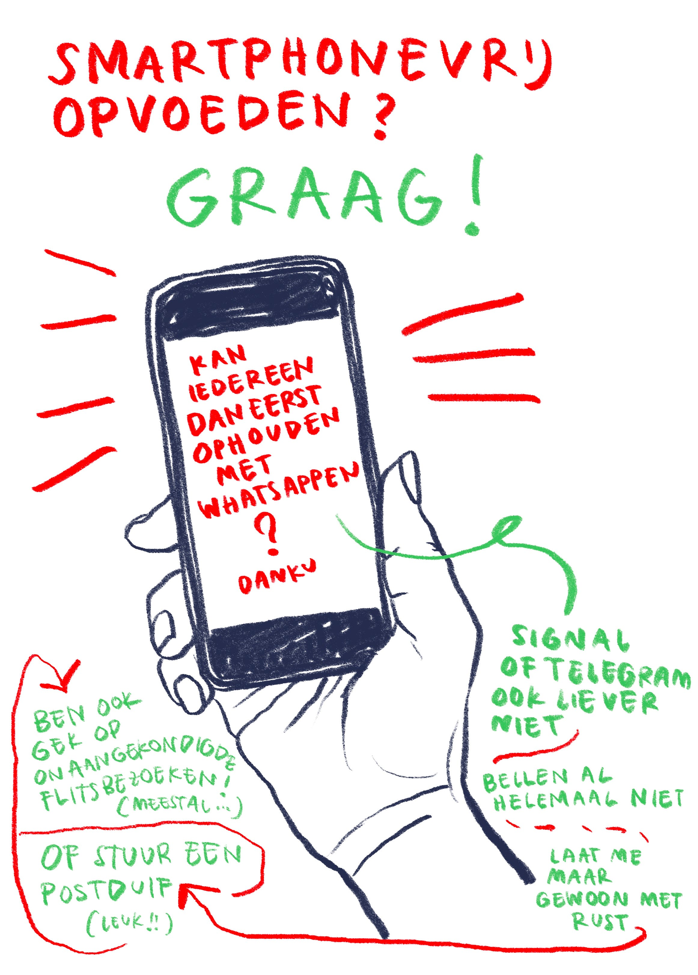 We vinden bovendien toch tegenwoordig dat kinderen smartphonevrij moeten opgroeien? We willen geen slecht gehechte kinderen de wereld insturen, die onnodig bijziend zijn, concentratiestoornissen hebben, uitgroeien tot diep onzekere tieners met mentale problemen die tot hun schermtijd zijn te herleiden - of erger: tot de onze. We lezen erover, knikken ernstig, leggen demonstratief de telefoons weg, tot ze trillen en we toch weer lachend doorgestuurde gifjes openen.